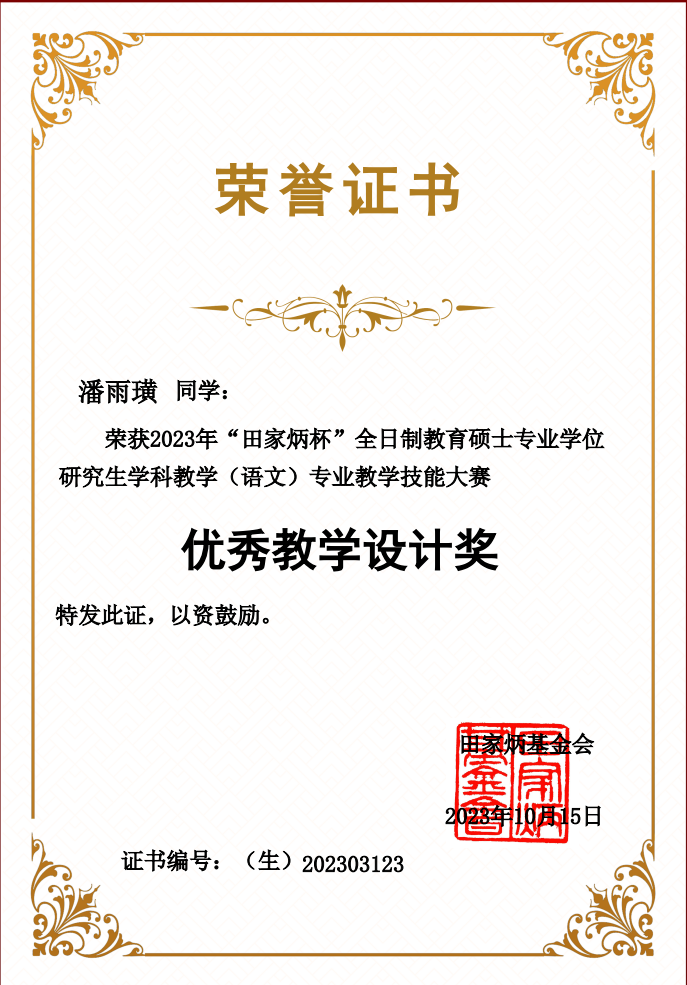 学科教学(语文)学生潘雨璜获奖证书