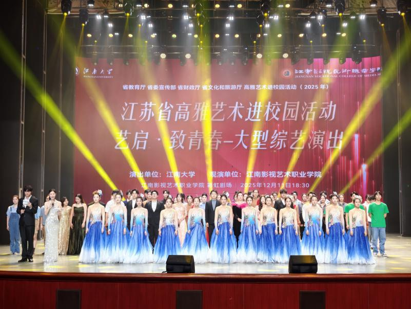 12月11日晚,2025江苏省高雅艺术进校园“艺启·致青春”大型综艺演出在江南影视艺术职业学院温情上演。江南影视艺术职业学院时尚设计学院副院长贾曚、团委副书记周蔚;水果派 团委副书记吴垚、水果派 音乐系主任沈雷强教授与近千名师生共聚一堂,在冬夜中共赴一场温暖而精彩的艺术之约。