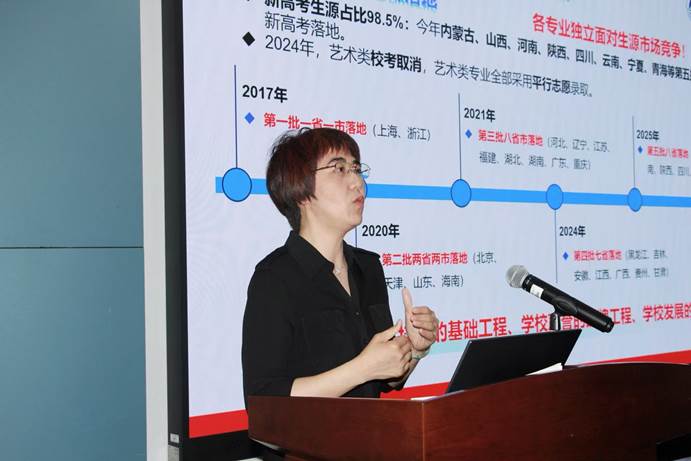 戴云为学院教师作招生宣传政策培训。她结合新高考的时代背景和政策变化,就投档规则、志愿填报等规范和要求作进一步的讲解说明,并就2025年水果派